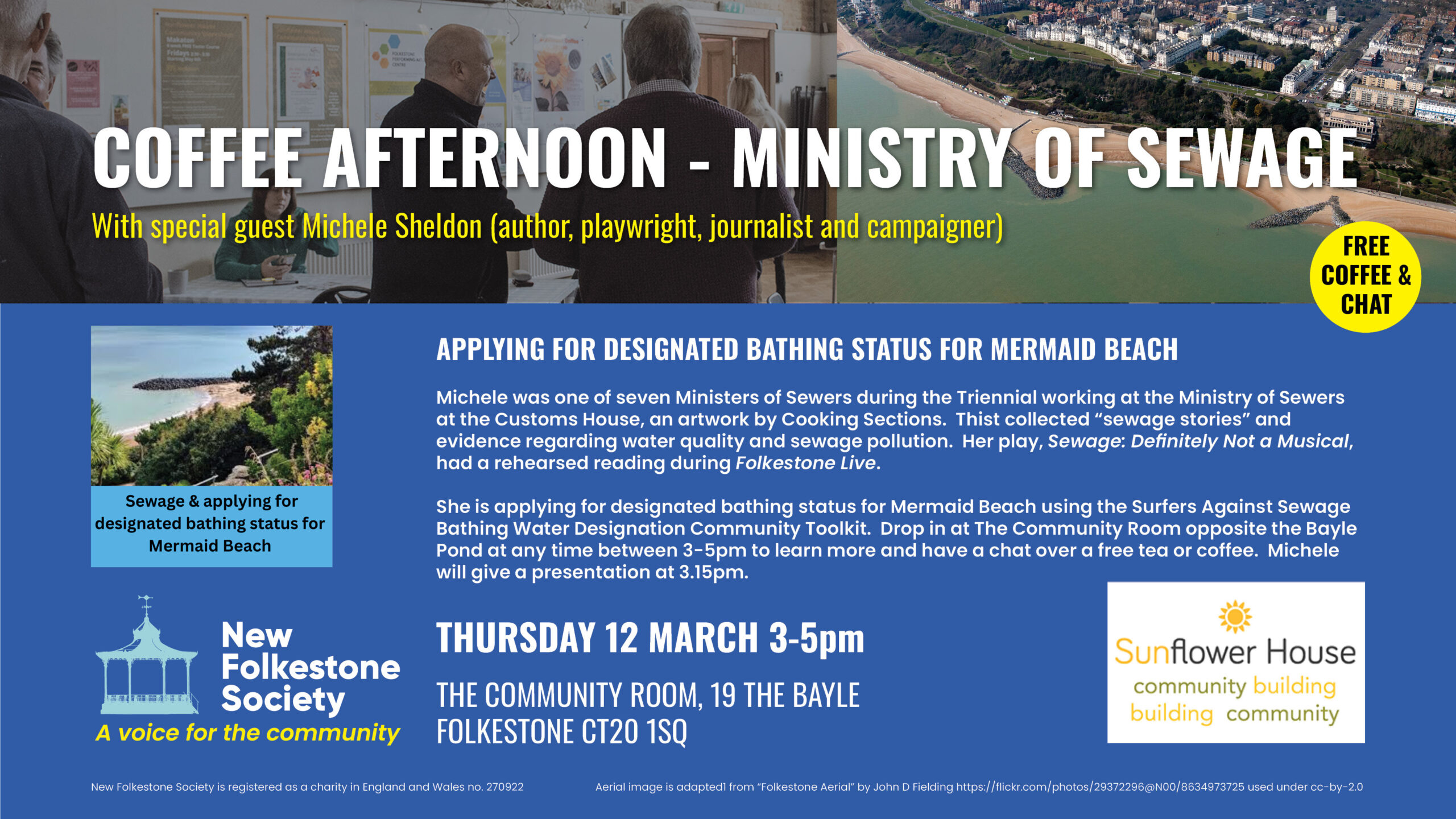 The Community Room 19 The Bayle, FolkestoneThursday 12 March 3-5pm The Community Room, 19 The Bayle It is a topic that many are concerned about, but what is being done about the water quality on our beaches? Michele Sheldon was one of seven Ministers of Sewers during the Triennial working at the Ministry of Sewers at Custom House - an artwork […]